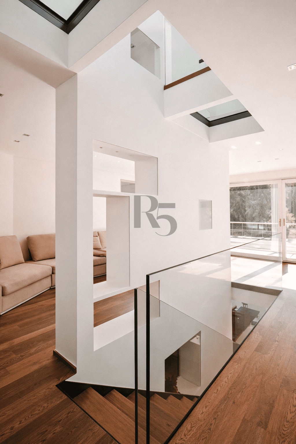 La maison bénéficie de larges baies vitrées, d'un puits de lumière central traversant les niveaux, ainsi que d'un niveau inférieur de plain-pied avec le jardin, offrant une luminosité comparable à un rez-de-chaussée.